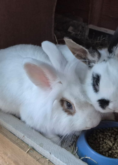 Their adoptive home needs to be a large hutch at least 1.8m x 0.6m x 0.6m (or maybe a converted shed) with continuous access to a predator-proof run at least 3m x 2m x 1m high. This pair are especially fond of keeping their feet dry, so would welcome as much shelter from the weather as possible. We are happy to advise on rabbit housing.